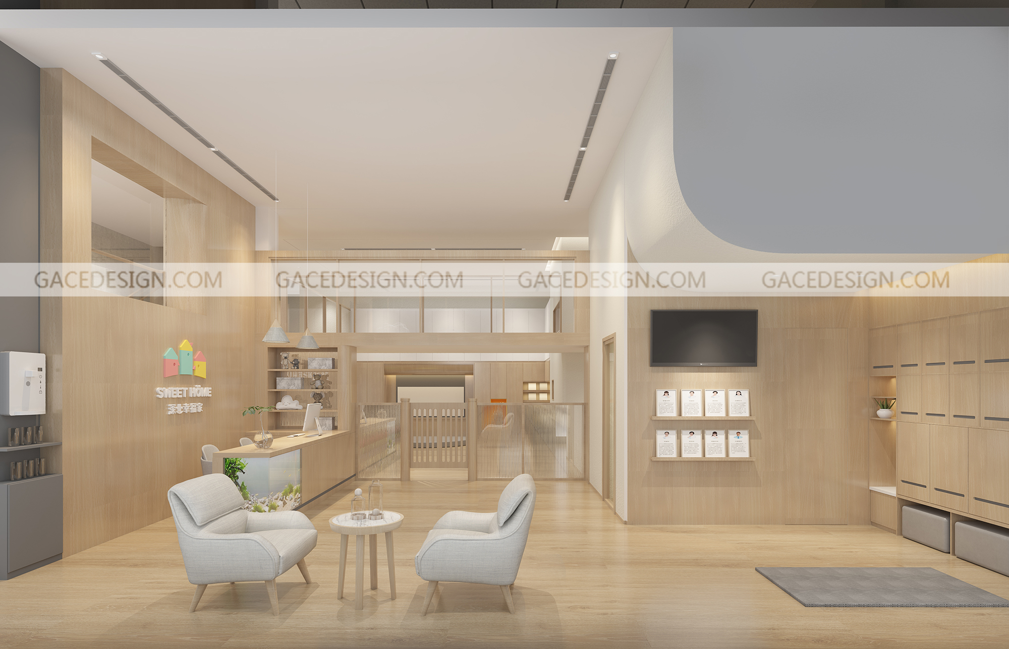 從前廳入口,我們設置了一個門廳,孩子就像回家一樣,在門廳處就完成了換鞋和洗手的功能,孩子有專屬的換鞋凳和鞋柜。空間造型上我們進行了簡化,保留了原有的層高,讓陽光最大程度的映入空間。在前臺處我們還設置了孩子尺度可觀賞的魚缸。在空間基調上我們選擇了柔和木質材料與自然光線的映射,使空間呈現明快輕松的氛圍。為了讓孩子自己與環境互動,我們在一層設置了一個空曠的空間,孩子們能夠在這里安全的爬行和玩耍,我們根據不同年齡段孩子的需求還設置了不同的區角,益智區、繪本角、涂鴉墻和感統區等等。在樓梯閣樓中我們加入了更多可互動性的功能。通過墻上的樂高墻壁,區域角的閱讀小書屋,攀爬區,滑梯,涂鴉墻。除此之外教室設計應充分的考慮孩子們的尺度和保育員的保育便捷和操作性。我們在項目中嘗試探討空間與兒童的探索關系。努力營造一種孩子可以自己發育成長的環境模式。