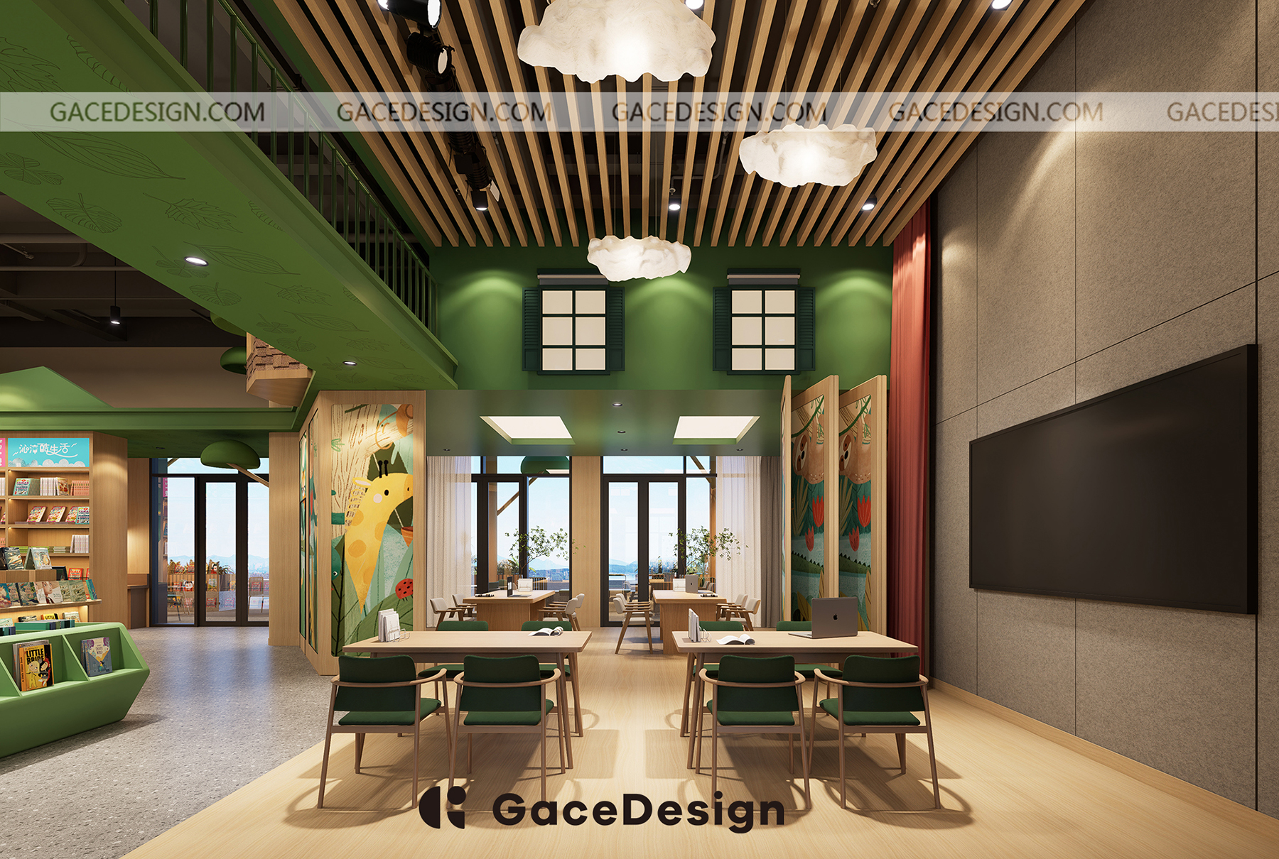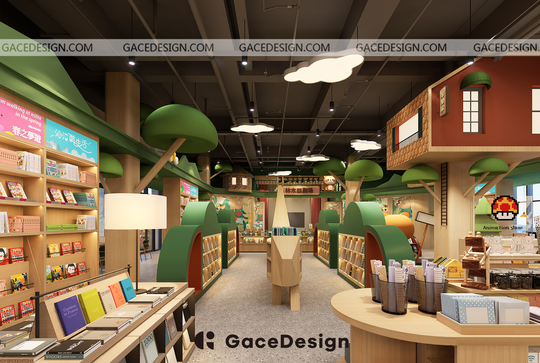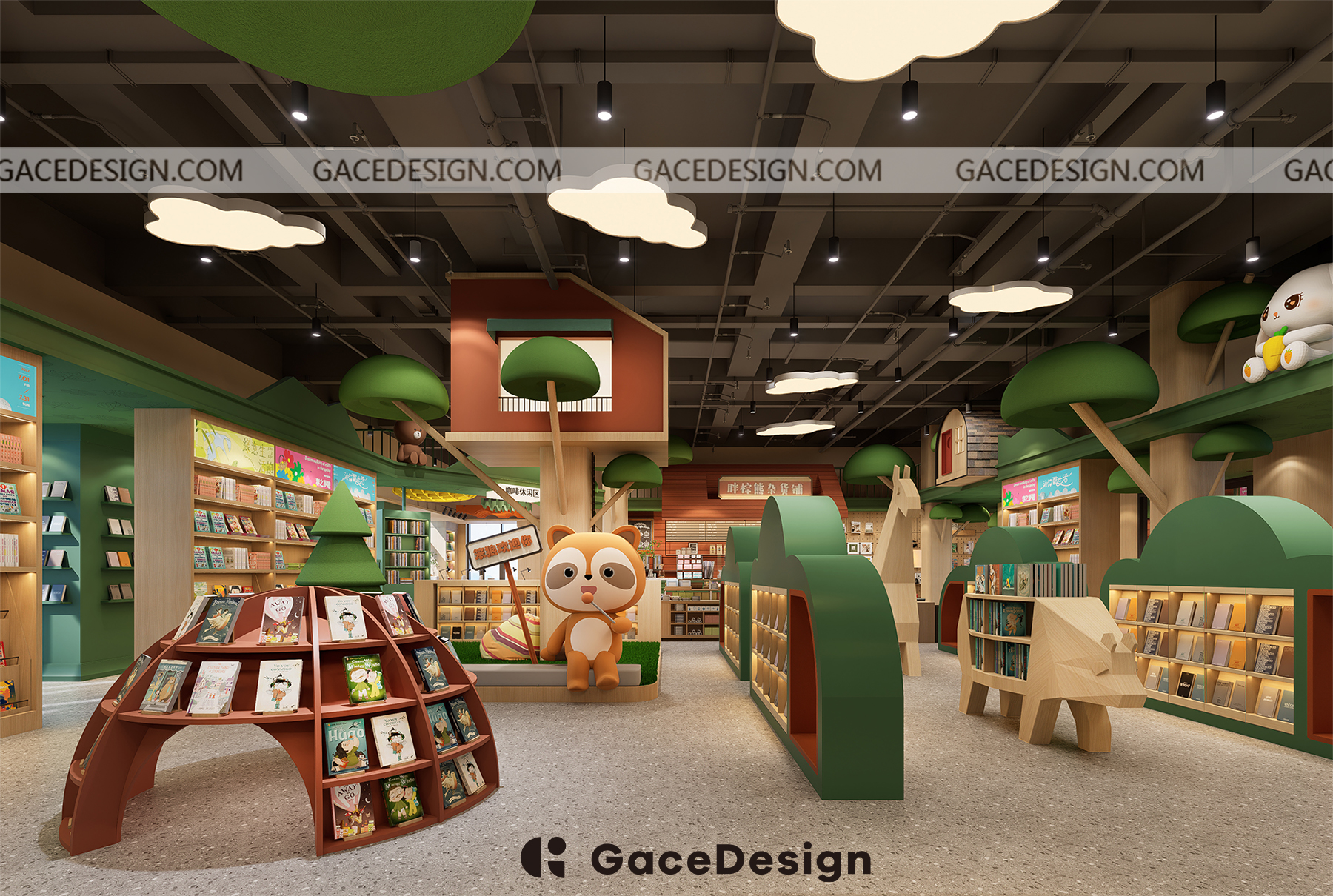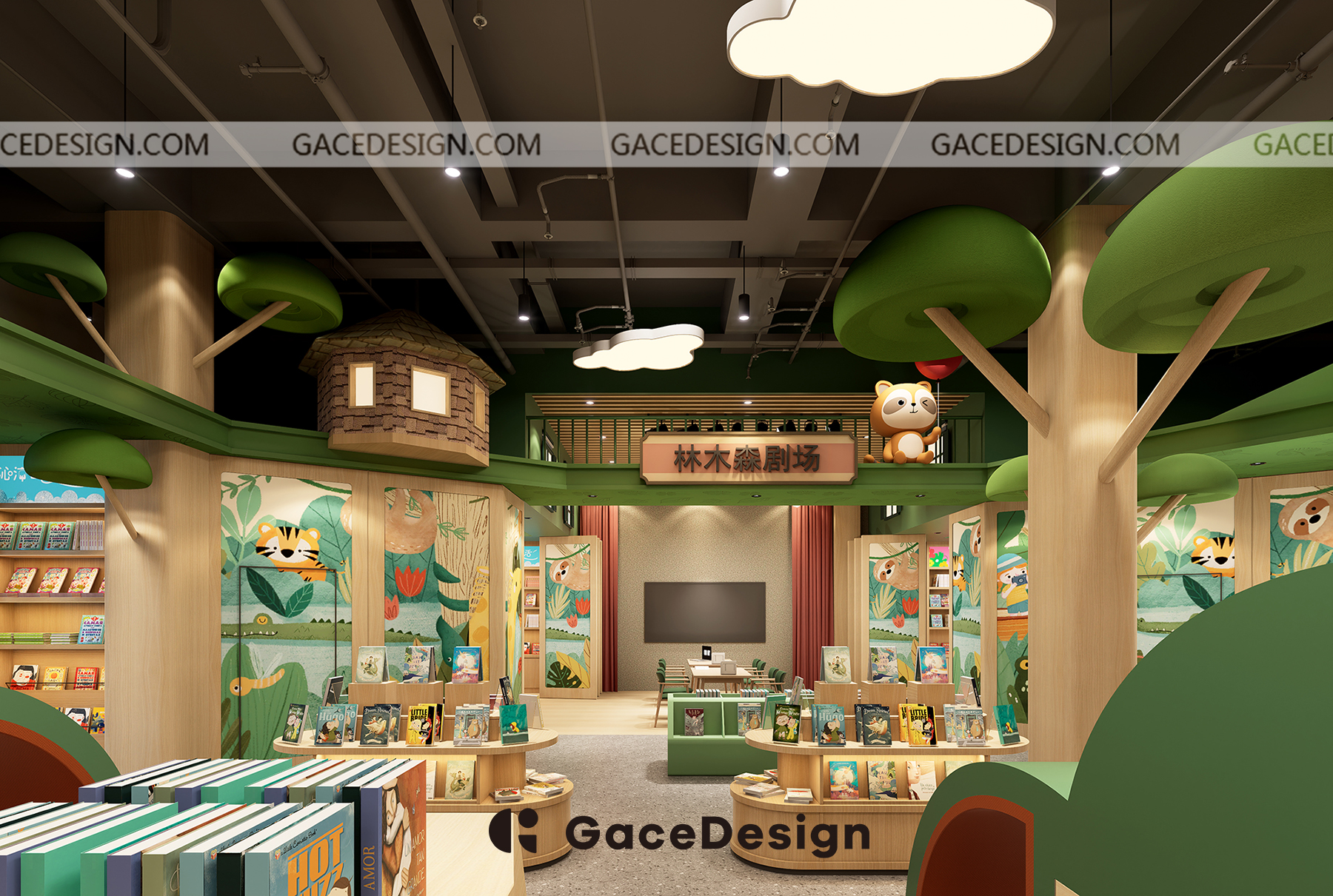 ?設(shè)計(jì)師希望給孩子更多類似森林的行走路徑,通過(guò)環(huán)境引發(fā)孩子自主尋找書的樂(lè)趣。以“室內(nèi)建筑”為設(shè)計(jì)理念,鋪設(shè)綠色草坪,在室內(nèi)開辟一處獨(dú)特的“森林仙蹤”場(chǎng)地,設(shè)計(jì)手法突出項(xiàng)目層高的優(yōu)勢(shì)。功能區(qū)猶如散落在森林的獨(dú)棟小屋,樓上樓下,院內(nèi)院外,皆是孩子的專屬天地。