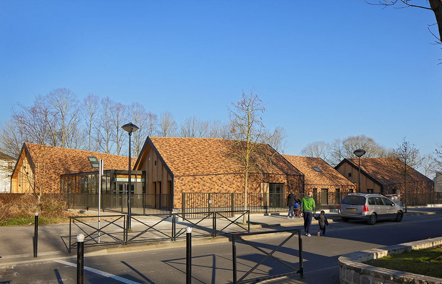 一座位于巴黎利耶于桑的幼兒園,設計師設計了大地色的陶瓷磚陶瓷磚的重疊像鵝卵石一樣覆蓋在獨特的坡屋頂建......