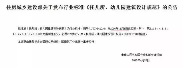 現(xiàn)批準(zhǔn)《托兒所、幼兒園建筑設(shè)計(jì)規(guī)范》為行業(yè)標(biāo)準(zhǔn),編號(hào)為JGJ 39-2016,自2016年11月1日起實(shí)施。其中,第3.2.8、4.1.3、4.1.9、4.1.12、6.3.3條為強(qiáng)制性條文,必須嚴(yán)格執(zhí)行,原《托兒所、幼兒園建筑設(shè)計(jì)規(guī)范》JGJ 39-87同時(shí)廢止。