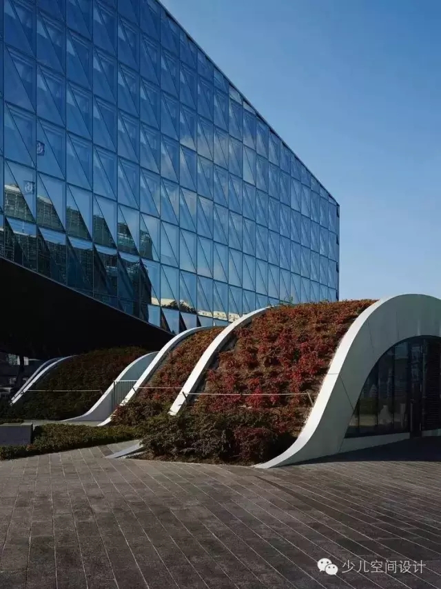 建筑所采用的常規(guī)結(jié)構(gòu)及其交替起伏的形態(tài)在基地滿鋪,屋面被植株所覆蓋。這種手法在起伏的凸起部分形成遮蔽空間,凹面下則為室內(nèi)活動區(qū)域。Origami 幼兒園的特殊性質(zhì)源于這種重復(fù)的幾何規(guī)律形態(tài),設(shè)計師運用了多種材料:金屬的窗戶豎框、橫梁與木材等。