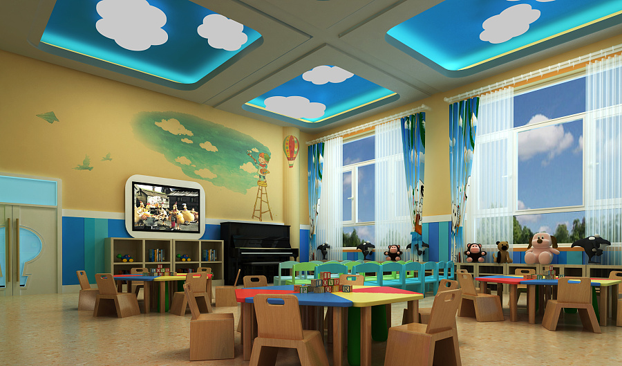 3、采用冷色和暖色強烈的碰撞,給人視覺的沖擊感很強。吊頂采用楓葉為元素,以獨特的思維方式,激發孩子們的想象空間。