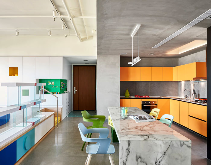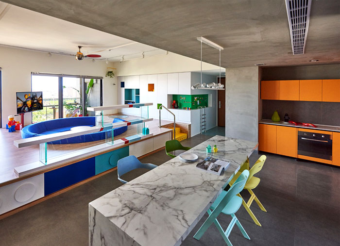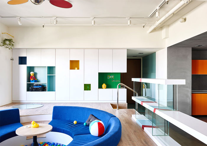 這是位于臺(tái)灣高雄的一座公寓,年輕的屋主希望將原先的公寓改造,作為樂(lè)高發(fā)燒友,他們希望新的設(shè)計(jì)可以融入樂(lè)高的元素,不僅滿足了自己的喜好,也讓家中的小朋友有娛樂(lè)的空間。