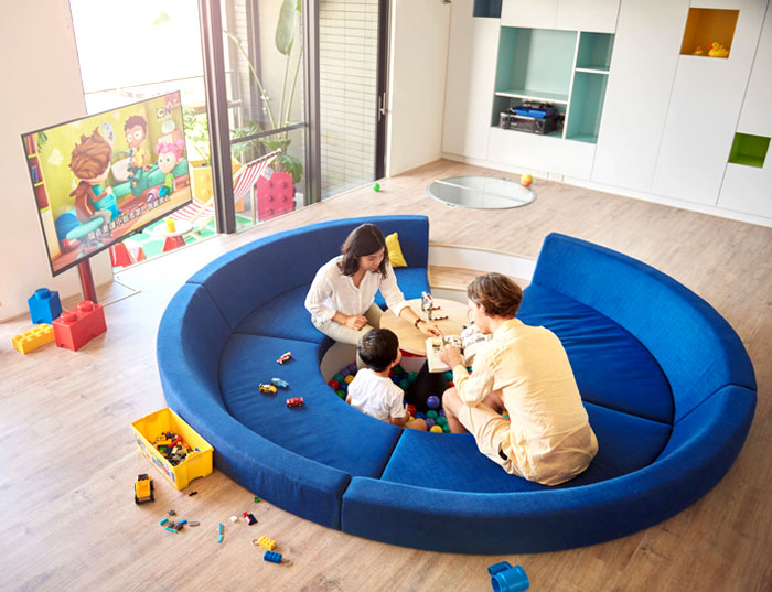 一般家庭最為重視的客廳區(qū)域卻被 HAO Design 改成了家庭活動(dòng)區(qū),下沉式的藍(lán)色圓形沙發(fā)讓空隙處變成了一個(gè)游戲池,倒入海洋球,一家人的溝通從此處開(kāi)始,可旋轉(zhuǎn)的電視讓任一角落都能觀看。整面的儲(chǔ)物柜讓雜物隱于無(wú)形,干凈整潔的空間更適合孩子的玩耍。(幼兒園設(shè)計(jì))