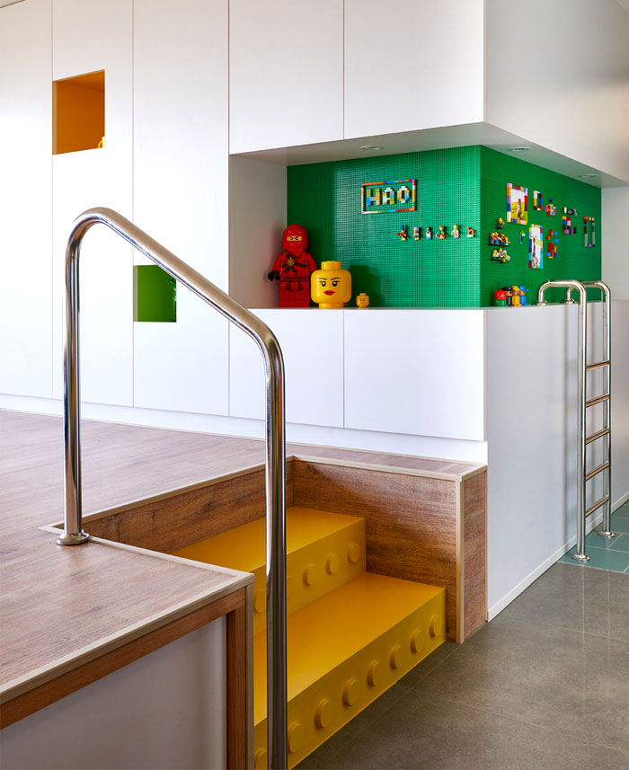 在任一角落似乎都能捕捉到樂(lè)高元素,臺(tái)階,展示柜,餐桌甚至是墻上的掛畫(huà)都被打上了標(biāo)簽,不同色彩的積木條不僅增添趣味性還讓整個(gè)空間變得豐富起來(lái)。