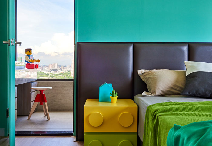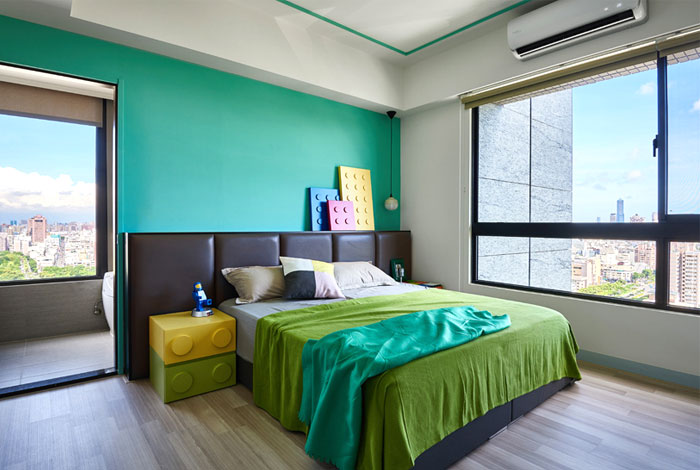 藍(lán)色,綠色,黃色,臥室的色彩十分的跳躍,必不可少的樂(lè)高元素讓臥室起來(lái)就像是玩具中的空間,利用大窗戶帶來(lái)的良好采光,降低鮮艷色彩帶來(lái)的視覺(jué)疲勞,這樣一個(gè)充滿童趣的空間也拉近了父母與孩子的距離。