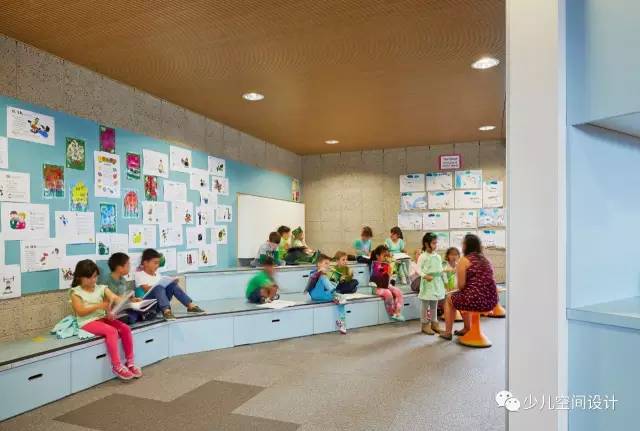 由于材質面板呼應色彩鮮亮的學生作品和家具,學校顯得熱情好客和溫暖;深色調與寬闊的玻璃相結合,增強了設施的透明度。大量插件板用于墻壁、地板和天花板,在廣泛的聲學處理中發揮關鍵作用,這是混合學習空間里必不可少的。(幼兒園設計)
