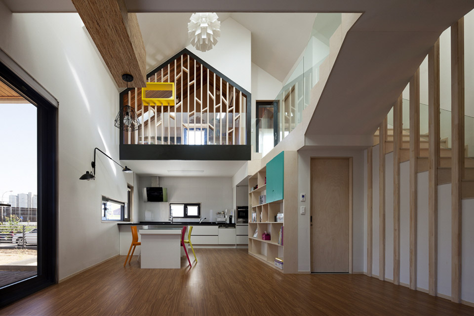 在韓國的益山州市有一棟英文字母“T”型的房子,這棟房子是采用30里面后的膠合木建筑的全木質(zhì)住宅,在T字的兩個(gè)端頭被挑起,分別的形成了入口門廊和客廳的花園休閑平臺(tái),一層為開放的大空間,包含了起居室,廚房和餐廳,第二場則是私人空間,設(shè)有書房,游戲廳和臥室等房間。