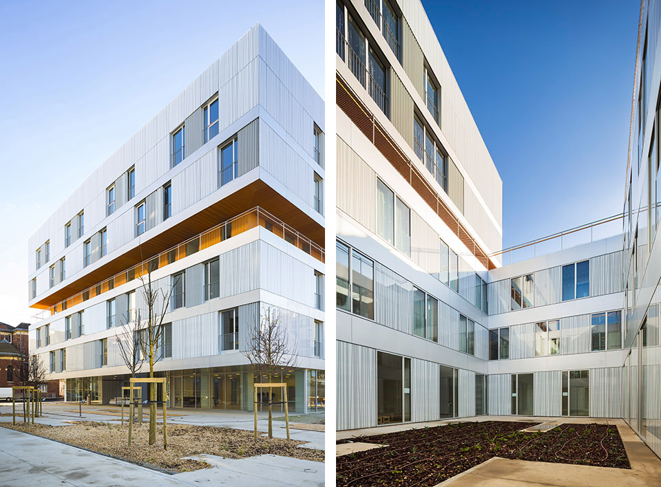 第四層體量向后回縮,形成舒適寬大的通廊。建筑有兩個(gè)內(nèi)院。建筑是穿著細(xì)網(wǎng)狀物外觀形成一個(gè)保護(hù)層的穿孔金屬板統(tǒng)一設(shè)計(jì),點(diǎn)綴和過濾,花園和露臺(tái)很容易通過大玻璃門,第四層通廊深暖色與建筑周身銀色外觀形成鮮明對(duì)比。