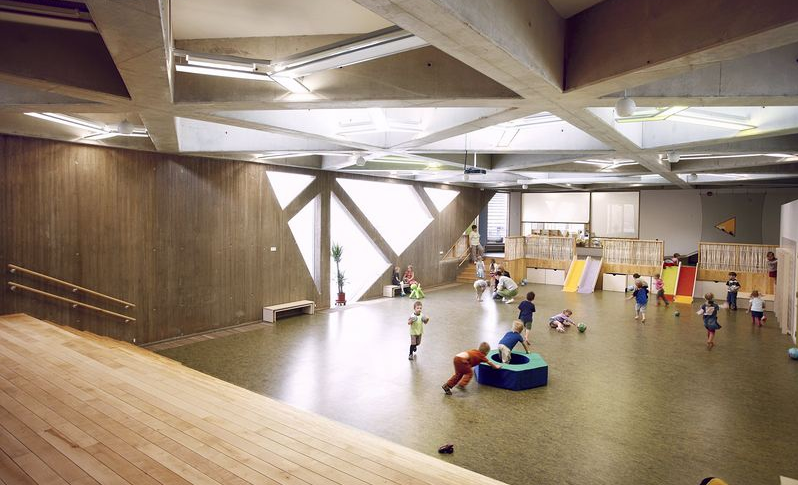幼兒園設(shè)計(jì)的構(gòu)造非常頭特色,六個花瓣里面包含了幼兒園家庭房間、創(chuàng)意教室、廚房、餐廳和行政辦公室。這個星形的建筑使得室內(nèi)采光充足,親密的庭院之間形成翅膀。就像是花朵一樣的結(jié)構(gòu)構(gòu)造了幼兒園內(nèi)部院子相連的華麗格局,設(shè)計(jì)師為了更好的利用院子,幼兒園的北面基地和街道做出了明顯的界限,有著才是玻璃做成小窗戶的混凝土的墻面,還有和幼兒園奇齊平的竹子?xùn)艡诎延變簣@和外界相隔開來。