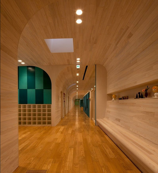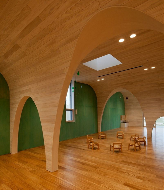 一所位于日本愛知縣張地區(qū)的旭城這是給五歲一下的一百多個(gè)孩子使用的幼兒園,在過去很多的幼兒園中孩子們的日常活動就像是吃飯玩耍和上廁所或者是睡覺都會是在分開的各個(gè)室內(nèi)進(jìn)行的,然后設(shè)計(jì)師的目標(biāo)是想在一種連續(xù)時(shí)間狀態(tài)下去捕捉孩子的這些活動,并在這個(gè)時(shí)間容器中布局建筑以及藝術(shù)繪品,共同創(chuàng)造出好似一個(gè)立體圖畫書般的幼兒園。(幼兒園室內(nèi)設(shè)計(jì))