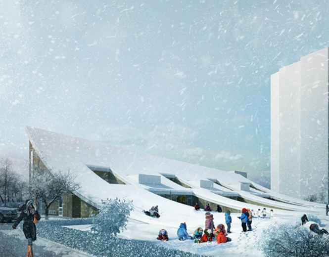 Rastvor的建筑師展現給我們的“山形幼兒園”,傾斜的綠色屋頂好似從地面掀開的一張綠紙,驚鴻一筆卻可以窺視這個因循守舊的規則街道所賦予城市的無聊紋理,而這些無聊的紋理周而復始組成了我們賴以生存的城市,從出生到死亡,每個人都屈從于規則之下,卑微而茍且。Rastvor的構圖語言是如此鋒利,使屋頂和地面的界限變得模糊。在街道望向幼兒園,如同一段斷裂的地紋,既給孩子們創造了一個特別的活動空間,更讓人聯想到孩子們與眾不同的想象力。(幼兒園設計)