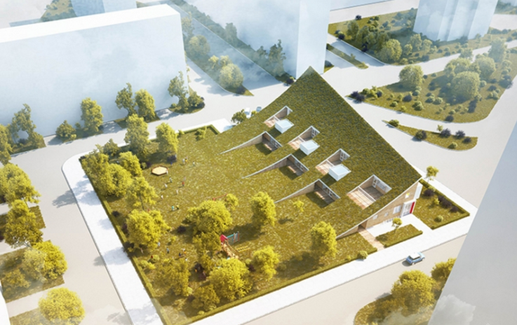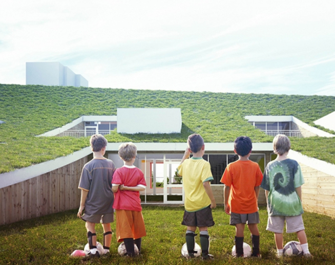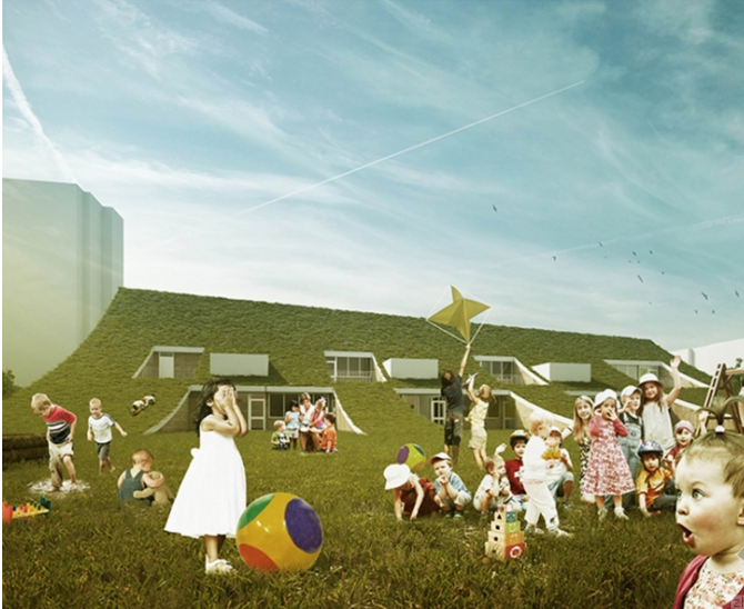 傾斜的屋頂結構是這座建筑最大的特色,它使屋頂和地面的界限變得模糊。傾斜的屋頂煙臺可以為幼兒園的教室帶來更多的陽光。在街道的入口處,幼兒園的屋頂急劇抬高。在街道上望向幼兒園,像是個滑梯,很有特點。整個屋頂是綠色的,給孩子們創造了一個連續的活動空間。傾斜的屋頂煙臺也可以為幼兒園的教室帶來更多的陽光。這個設計打破了板整的規則,不去扼殺孩子們愛玩兒的天性,更是為孩子們的學習場所增添了許多的夢幻元素,符合兒童的心理。
