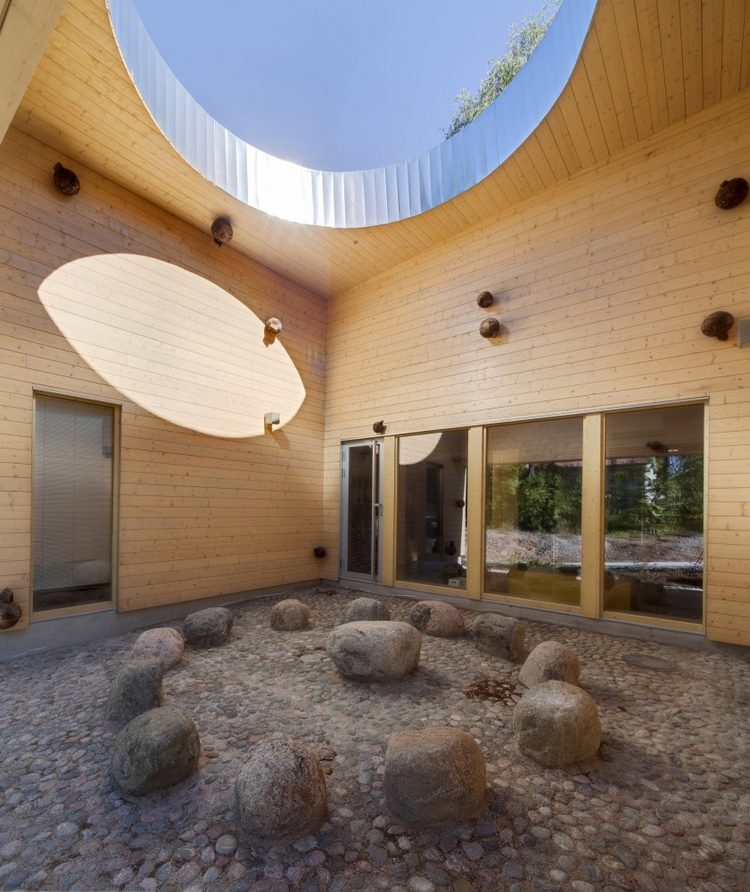 整個建筑鋪砌一新的內(nèi)部庭院朝向門廳開放,會內(nèi)的天花板上有一個巨大的露天圓形開口,隨著時間的推移使得移動的陽光成為了室內(nèi)庭院中一道亮麗的風景,庭院內(nèi)還有這藝術(shù)家創(chuàng)作由20個落葉松木制作的球體組成,代表著宇宙的雕像。(幼兒園室內(nèi)設計)
