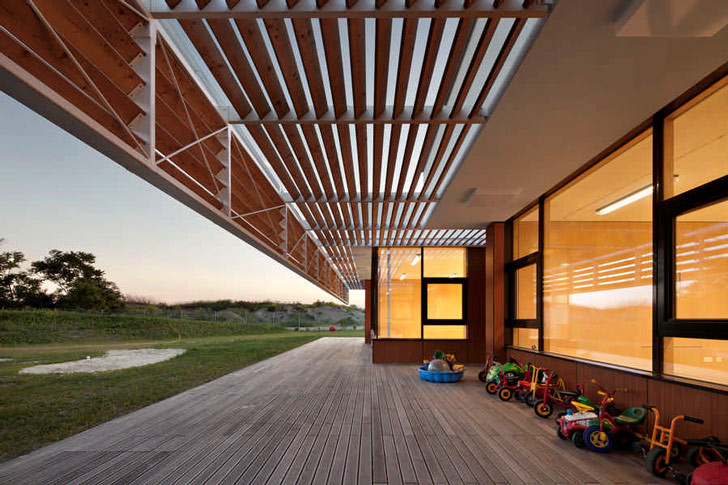幼兒園設計師在設計時充分考慮并側重于資源利用和環保概念,整個建筑采用中控通風系統,通過地下隧道引入新鮮空氣,在冬季預先加熱,夏季則進行冷卻。熱水來自水熱泵,并在戶外花園設置了雨水蓄水箱。