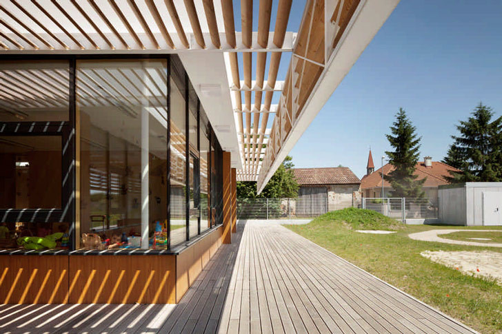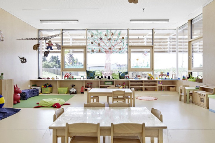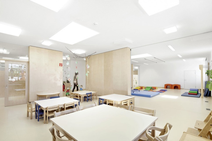 屋頂的設計和開放活動室形成一個新的介于內部與外部之間的空間。通過在南北方向的單位位移,在活動室之間形成了視覺連接效果。這個專門為幼兒園設計的活動室完全可以融入教學工作中。
