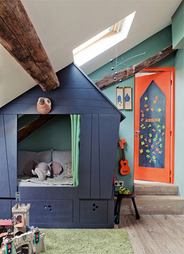 在兒童房里搭建一個小小的木屋,木質的地板再碰上綠色如同綠草一般的柔軟地毯,讓孩子在房間里能體會到室外的感覺,而且屋中屋的設計也會很受孩子的歡迎也會給孩子更多的空間安全感。