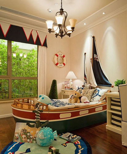 把床打造成船的造型,上面的裝飾都細膩連救生圈逗非常的逼真,從頂上的燈光照射在白色立體條紋的墻上整個兒童房的空間層次干非常豐富且具有童趣,很海軍風格的兒童房會給孩子帶來一種無限遐想的空間。