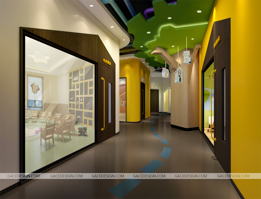 走廊具有行為指導的功能,這種功能是方向和指導幼兒左行右行倆方面,這個功能對魚那些剛剛進入幼兒園,對幼兒園還不是很了解而找不到自己教師的孩子們幫助非常大。