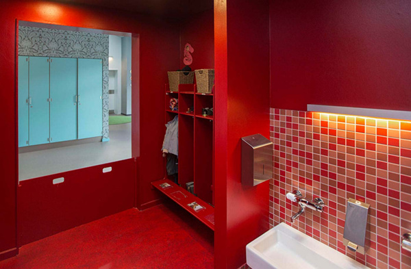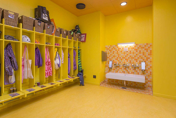 其幼兒園室內(nèi)設(shè)計“宛如一個珠寶盒”:在整個幼兒園的內(nèi)部都是繽紛的色彩、復(fù)雜的圖案和不同的肌理愉悅了孩子們的身心。同時裝飾有色彩、圖案豐富的壁紙和瓷磚。建筑如同一個大型的珠寶盒,這能夠喚醒孩子的好奇心,培養(yǎng)孩子們的探索精神,而且還為孩子們創(chuàng)造出五彩的內(nèi)部空間和趣味十足的游樂場供孩子們玩耍嬉戲,有趣的活動空間設(shè)計讓孩子們的由著足夠是運(yùn)動量。雖然平面布置十分復(fù)雜好似迷宮,但不同的色彩便于人們辨別方向。