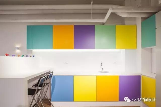 就餐區(qū)和休息區(qū)是專門為家長(zhǎng)和老師設(shè)計(jì)的兩個(gè)區(qū)域,他們可以在這里交流溝通孩子的情況。就餐區(qū)在功能上是一個(gè)帶有多重色彩櫥柜的敞開式廚房,它這樣的設(shè)計(jì)還可以激發(fā)孩子的興趣以及異想天開的想象力。就餐區(qū)的顏色都源自Babysteps的標(biāo)識(shí)中相同的色調(diào),與幼兒樂園整體的設(shè)計(jì)在視覺上形成統(tǒng)一,同時(shí)它也與整個(gè)室內(nèi)空間微妙的單色調(diào)相互協(xié)調(diào)。