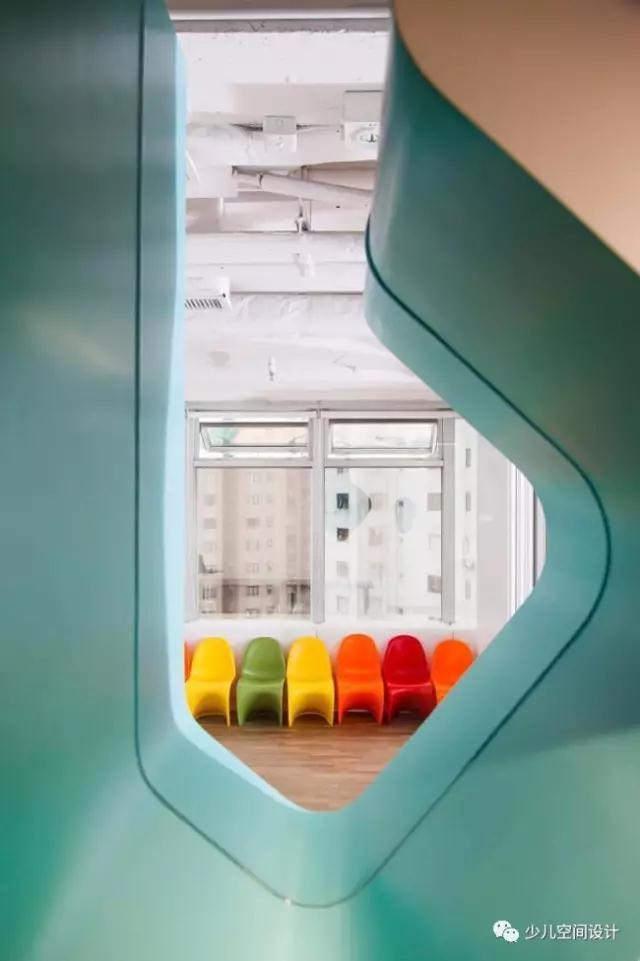 緊鄰的休息室是由鋸齒狀的三層平臺(tái)形成的區(qū)域,建在房間的一個(gè)角落,靠著窗臺(tái)玻璃幕墻的邊緣,并沒有占用孩子們的游戲區(qū)。無論是欣賞孩子學(xué)習(xí)的成果,還是日常點(diǎn)滴的進(jìn)步,休息區(qū)都為家長(zhǎng)提供了一個(gè)完美的視角去觀察孩子。