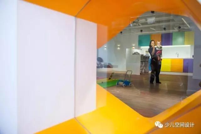 探索和運(yùn)動(dòng)區(qū)是幼兒樂園的重點(diǎn)區(qū)域。幼兒園室內(nèi)設(shè)計(jì) 在這個(gè)開放式的,明亮而怡人的活動(dòng)區(qū),可以容納多種運(yùn)動(dòng)方式:純粹運(yùn)動(dòng)的方式、感知觸覺的方式、還有安靜的方式。一面帶有幾何圖案的彩色墻壁極具特色,這堵墻圍成了一個(gè)儲(chǔ)存區(qū)角,并且自然而然地將活動(dòng)區(qū)內(nèi)不同方式的運(yùn)動(dòng)區(qū)分割開來。進(jìn)一步來說,這種分割還可以讓孩子和家長(zhǎng)通過墻上幾何圖案的窗框看到教室里面的情景。