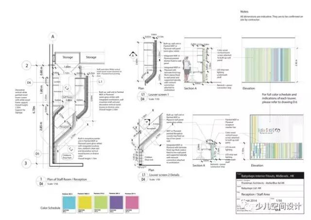 幼兒樂園的入口處設(shè)置了透明的玻璃門,純白色的金屬百葉窗,簡(jiǎn)潔利落的百葉窗顯得美觀大方。入口的一側(cè)還設(shè)有接待臺(tái),同樣是由柔和彎曲的彩色百葉窗造型設(shè)計(jì)而成。Babysteps的標(biāo)識(shí)置于接待臺(tái)后面的墻上,五彩的字體設(shè)計(jì)更顯活潑可愛。燈光打在百葉窗上形成微妙的光影,使得BabySteps產(chǎn)生了一個(gè)工藝的視覺形象。