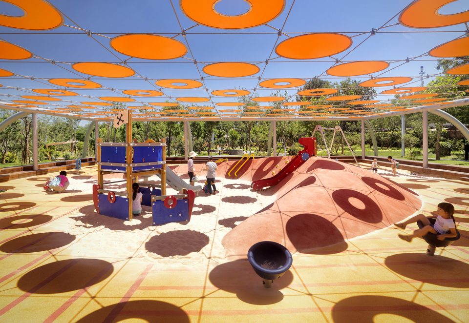 第一個游樂場是一個與景觀完美相融合的正方形區(qū)域。這個場地由木制長椅圍合成一個微微下沉的地塊空間。這種為家長提供的休憩空間也劃定了場地的界限,為孩子們創(chuàng)造了一個安全的游戲區(qū),讓他們可以盡情地玩耍。為了進一步增強圍合感和保護感,橙色圓盤構(gòu)成的天蓬懸浮在人們的頭頂上。這些圓盤在柔軟的游樂面上投射了一層棋盤狀的陰影,為孩子們遮擋陽光,驅(qū)逐炎熱。