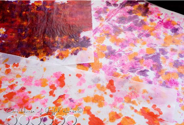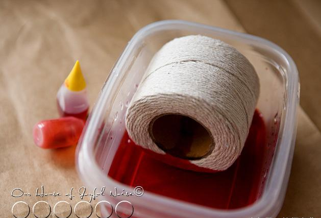 將食用色素放在不同的容器中加入水調和(黃色和橙色),線軸的不同側面浸泡在食用色素溶液中。(老師們也可以直接用絲帶代替)