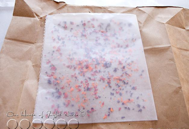 將牛皮紙鋪在蠟紙下面,削蠟筆屑