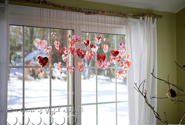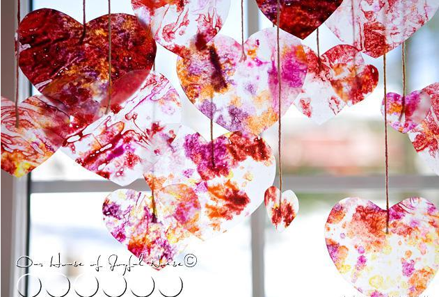直接用透明膠帶將心形圖案粘貼在窗子上,當陽關透過窗子照進教室時,會非常的漂亮。