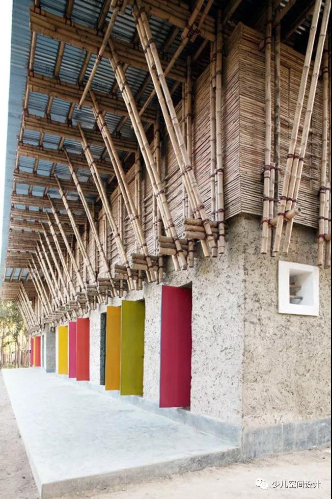 建筑的上層相對底層來說更加開放明亮,竹壁上的窗洞為樓上的師生體痛了 360 度的風景。寬敞的內部空間也為運動預留了足夠的場地。樹梢和池塘的景色通過窗戶進入二樓,來自竹條的光影穿過地板的縫隙,和天花板上紗麗鮮艷的色彩形成對比。