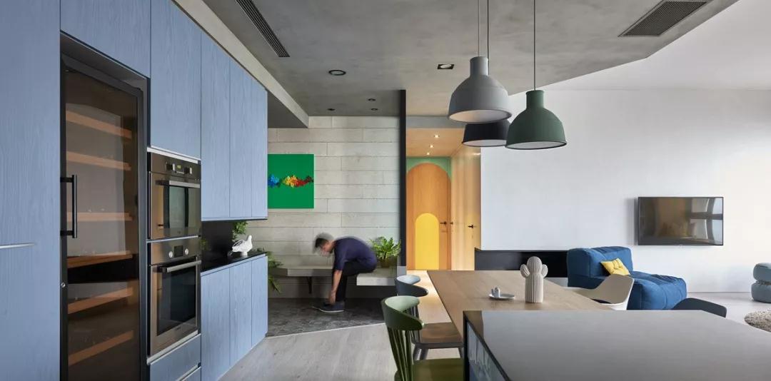 所有這些都散發出一種寒冷的感覺。高大的天藍色木紋櫥柜與斯堪的納維亞枝形吊燈的混凝土表面相配,給空間增添了些許溫暖。