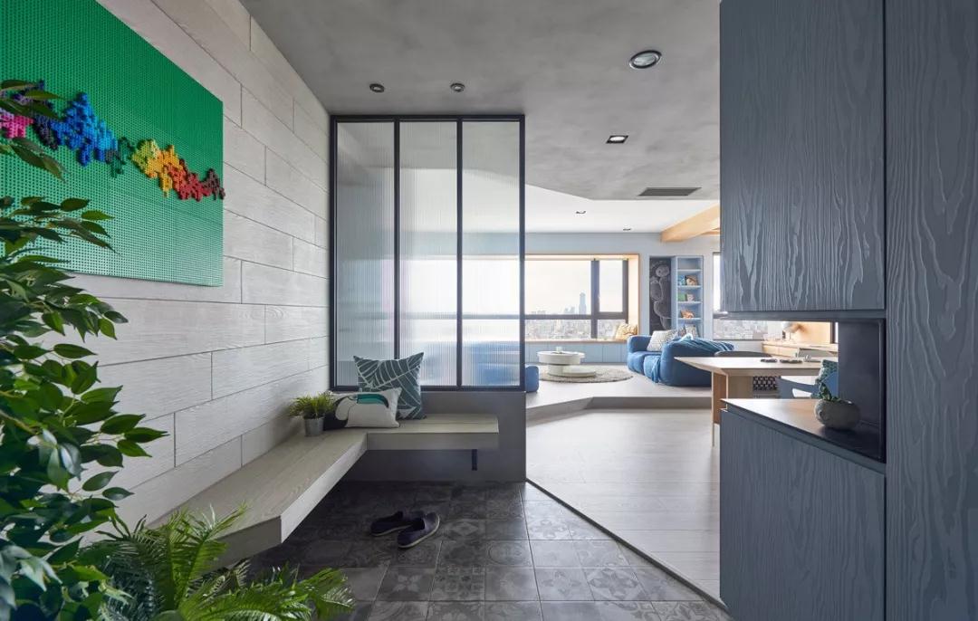 天花板上的木格板起到了簡單、和諧、詳細的空間隔斷的作用。當孩子長大后,分區下面的空間會給他們提供一個類似圖書館的閱讀空間。