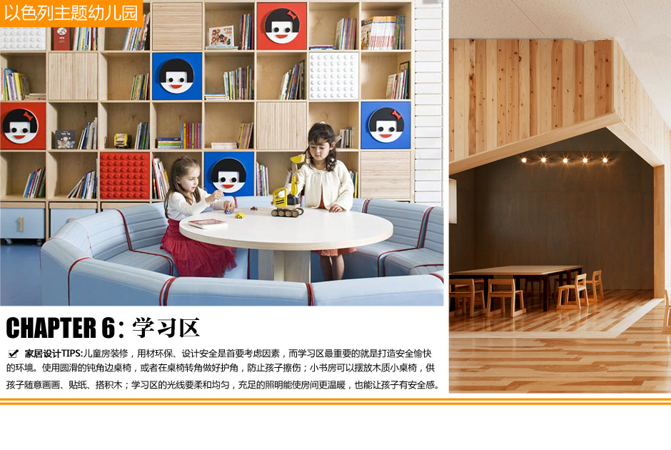 6、這里設置了一個讀書區,擺放了一張圓形桌,并繞圈桌子安置天藍色布藝沙發以供孩子們閱覽,還擺設了一架質地極好的白色鋼琴及其他樂器。書架由涂漆樺木建造,糅合了手工木質雕工工藝,三維立體木質浮雕書柜與幾何外形的孩童笑臉木片完美地結合。