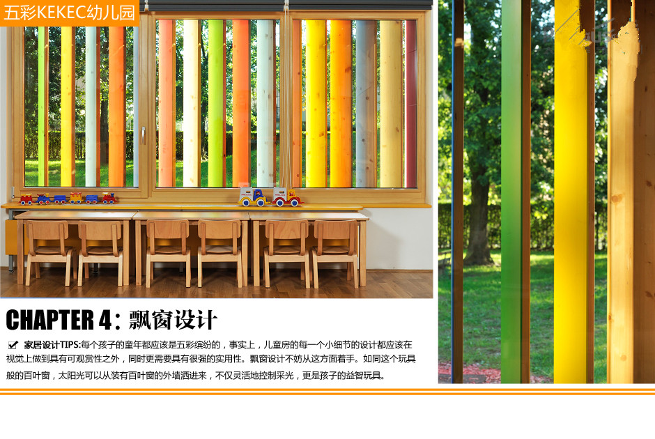 4、這座幼兒園建筑的玻璃表面裝有一層可旋轉的垂直百葉窗,百葉窗的木條一面漆有五顏六色的油漆,另一面則保持木材的原樣。這些木條除了可以用來遮光,為小朋友提供娛樂設施之外,還能讓小朋友們在玩耍中學會用雙眼分辨這九種顏色。