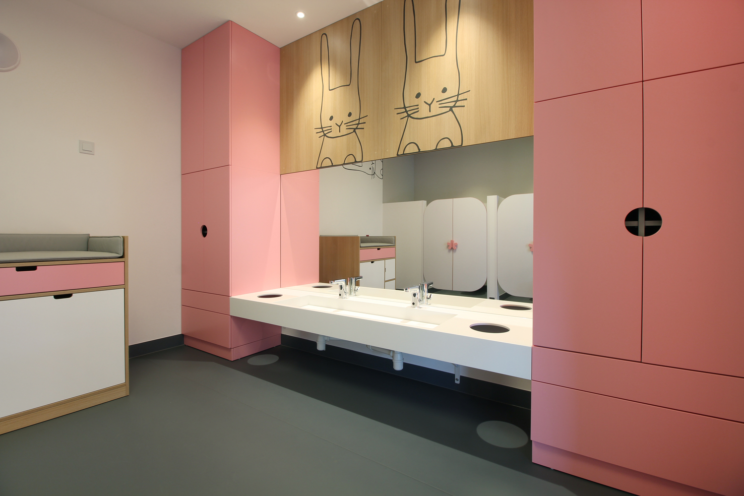 幼兒園衛(wèi)生間設計宜各班獨立設置,衛(wèi)生間與盥洗區(qū)之間宜隔開設立,高度不應妨礙老師隨時看護到孩子,要符合老師可以觀察到的高度。色彩選擇上,可以使用孩子們喜歡的亮色,造型上可以突出有趣,充滿童趣的空間環(huán)境。以孩子們的審美視角設計,能更好讓孩子們喜歡上幼兒園空間環(huán)境。